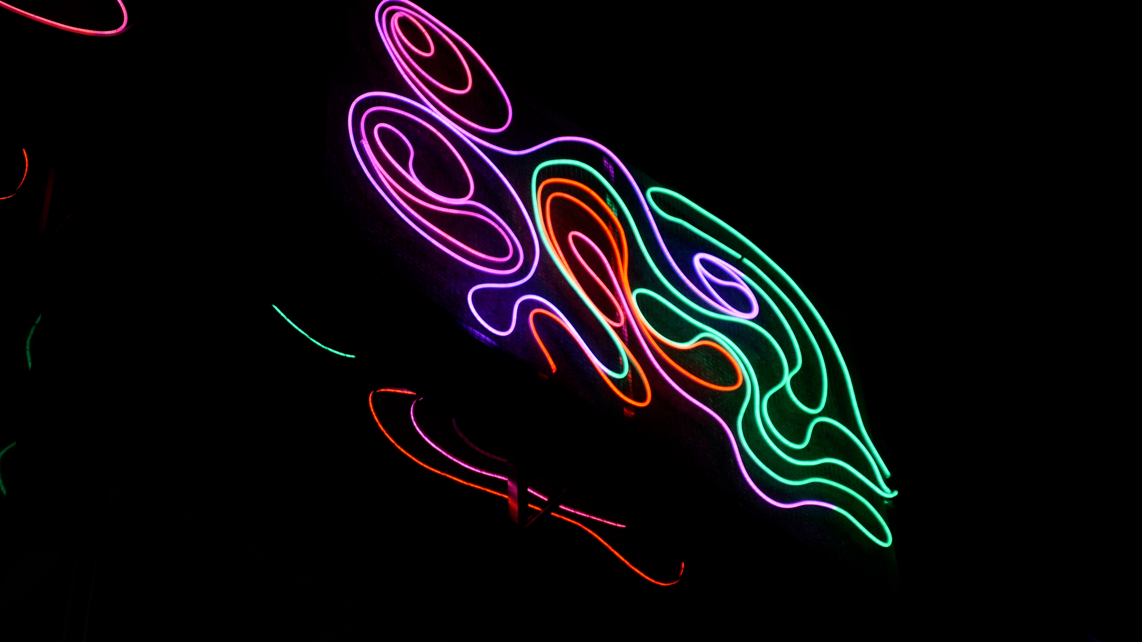 Friction Ridge, 2023 | RGB Silicone LED Light Strips mounted on Six Aluminum Frames (108” x 72”) - Three Exterior Façade/Two Interior-Facing, Raspberry Pi Computer w/ Real-time Interactive App coded in Python Language