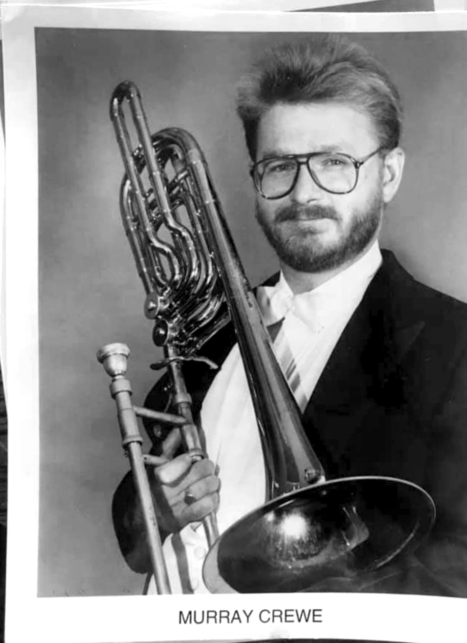 A headshot of Murray Crewe (1990) with his bass trombone, now belonging to Julia McIntyre and featured in the video, This Is for You. Also included, a detailed video still image of Murray’s fingerprints embedded in the body of the instrument.